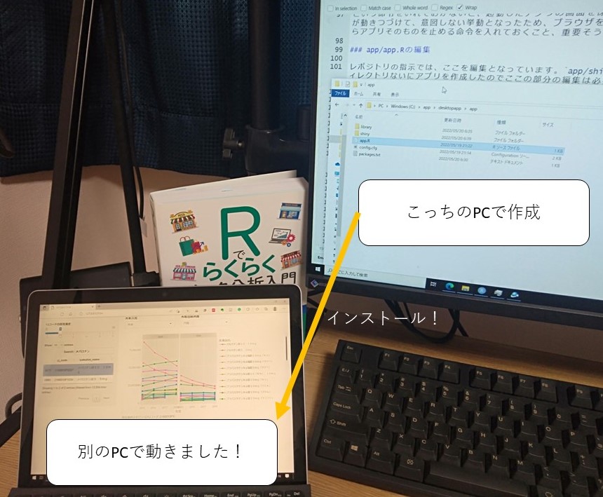 そのかわり、ブログ記事には、「DesktopDeployR」というWindowsユーザー限定のフレームワークについて言及されており、だめもとで利用してみたら、あっさり日本語を含んだShinyアプリがデスクトップアプリとしてインストールできたので、ここに、その試行錯誤の結果を将来の自分のためにも記録しておきます。