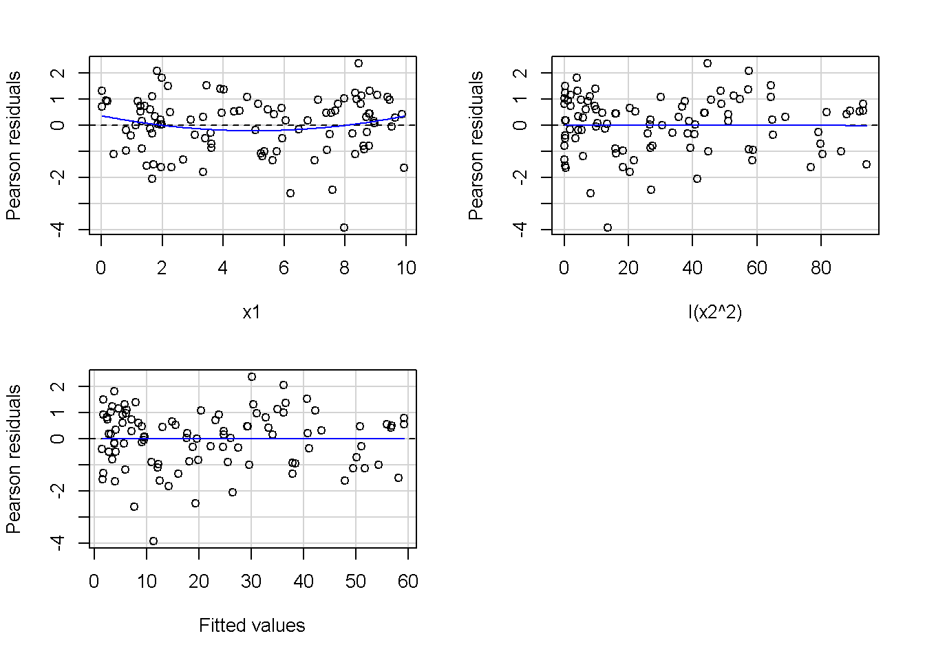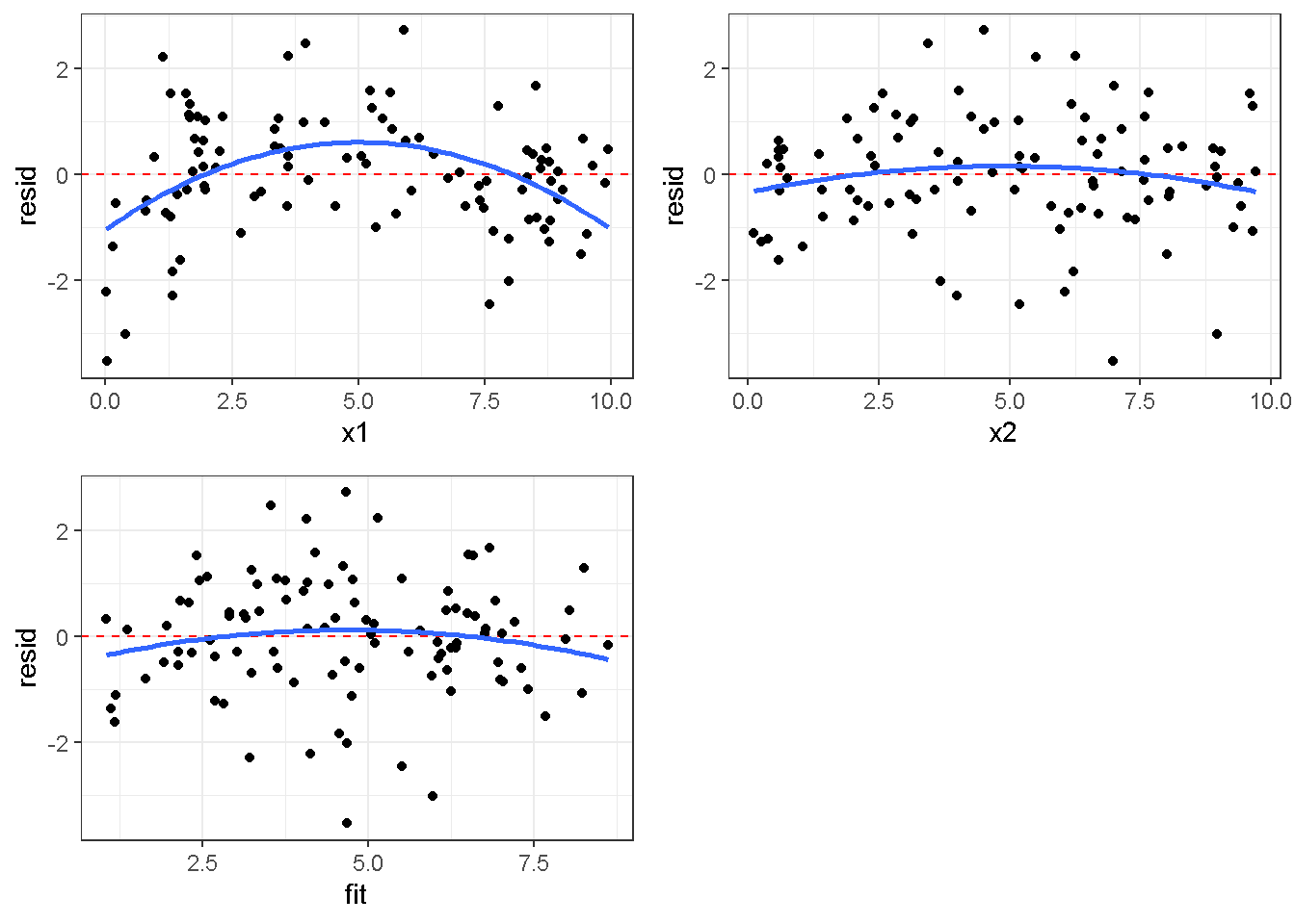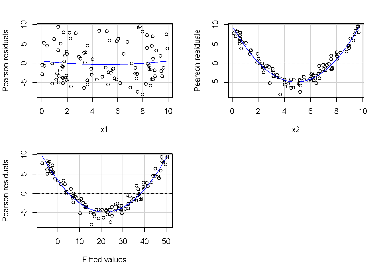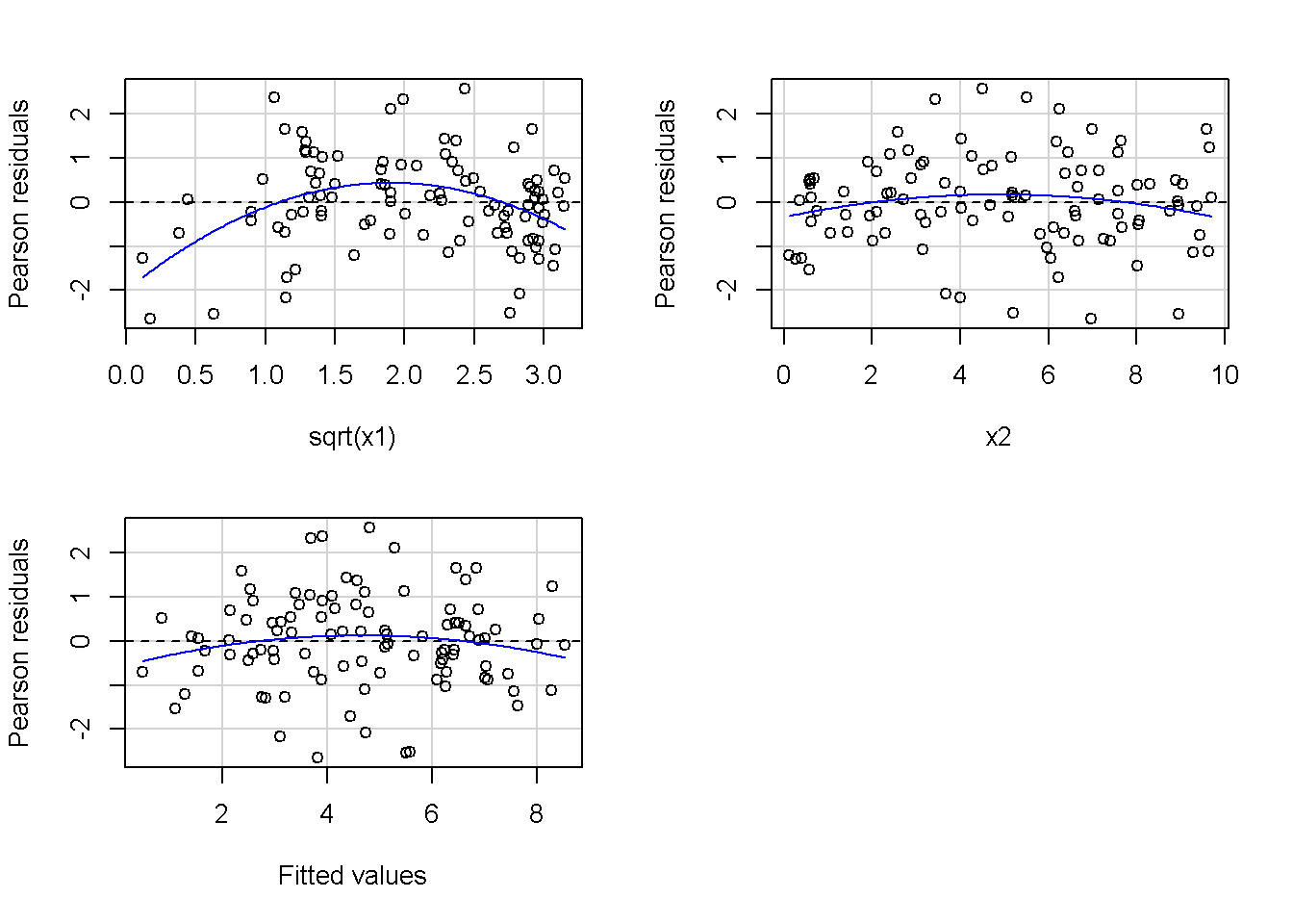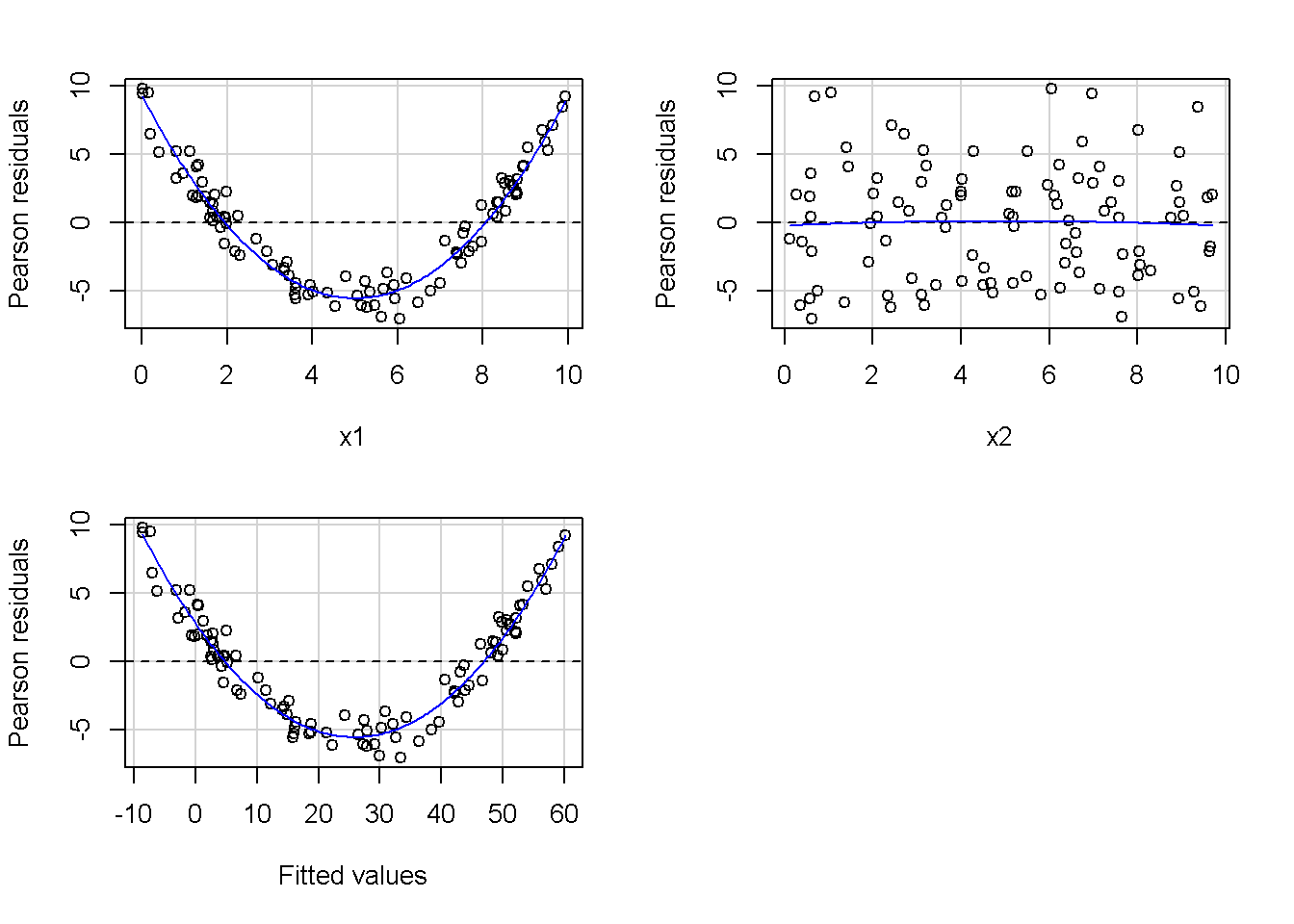 residualPlotsですると正しい形にするとx1はより曲がっているようにも見えます。