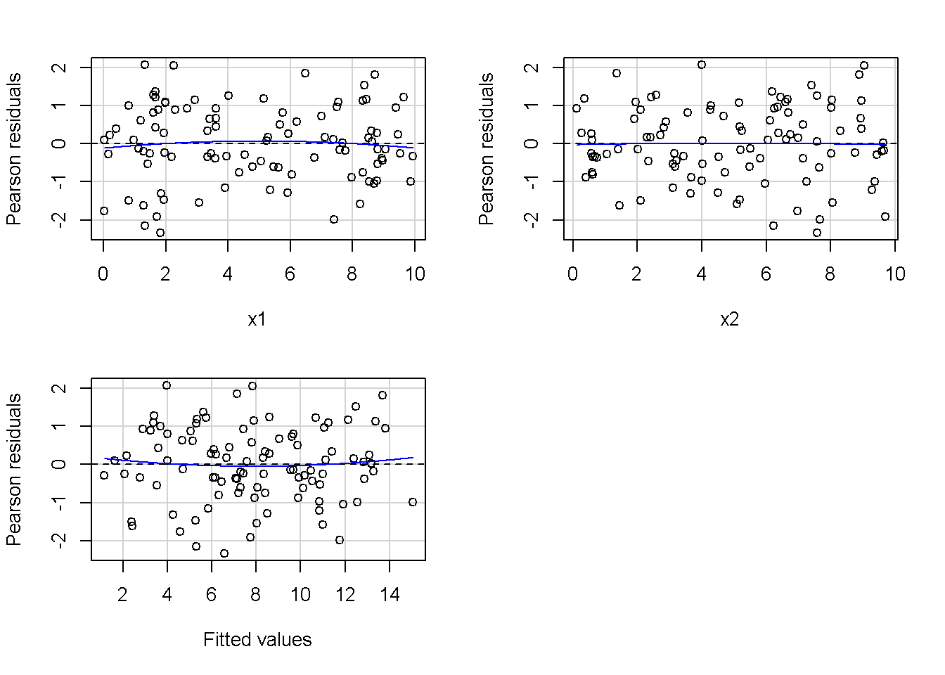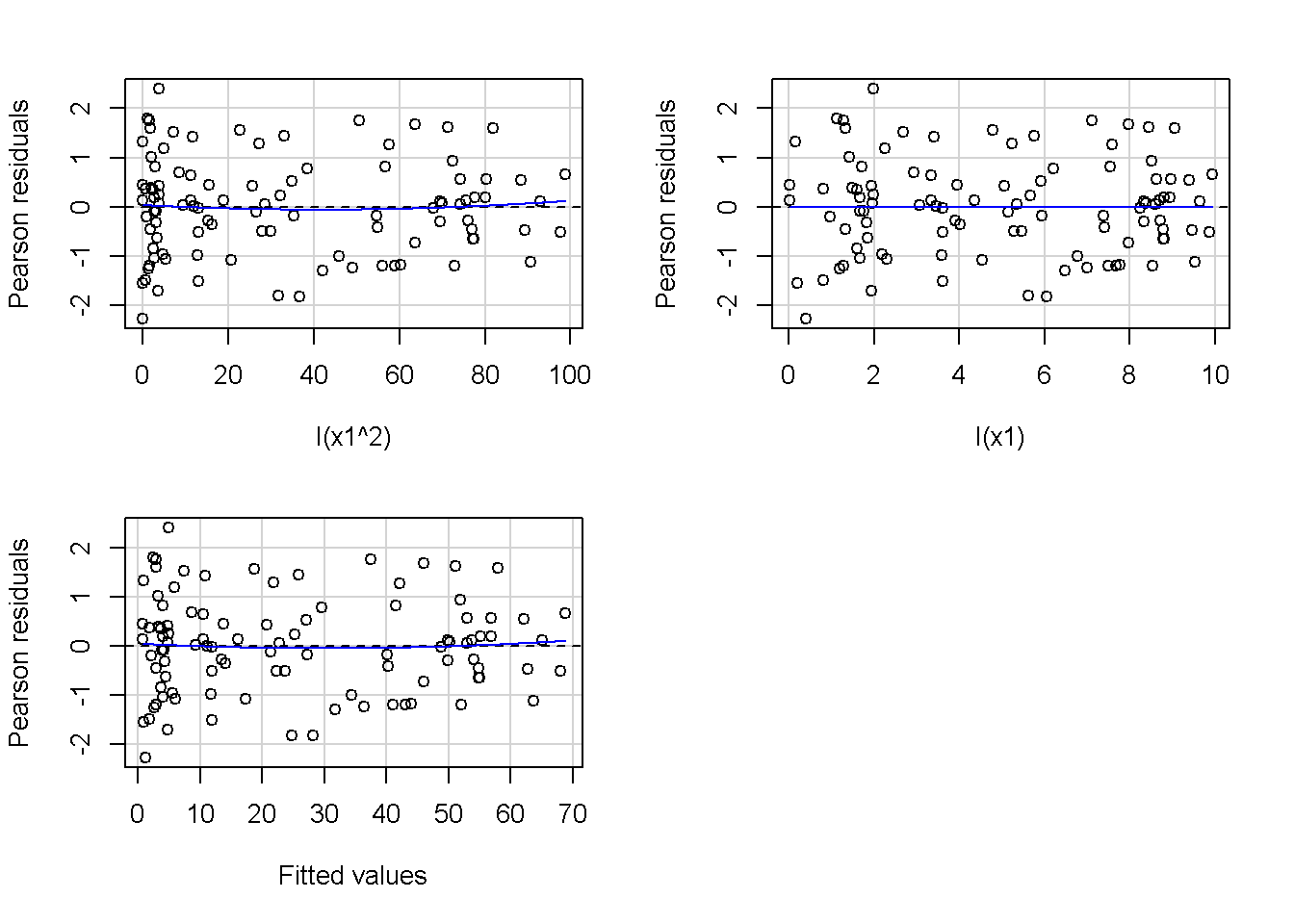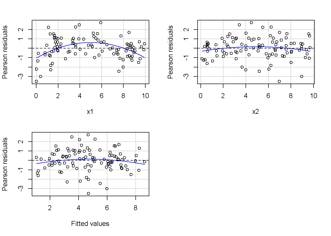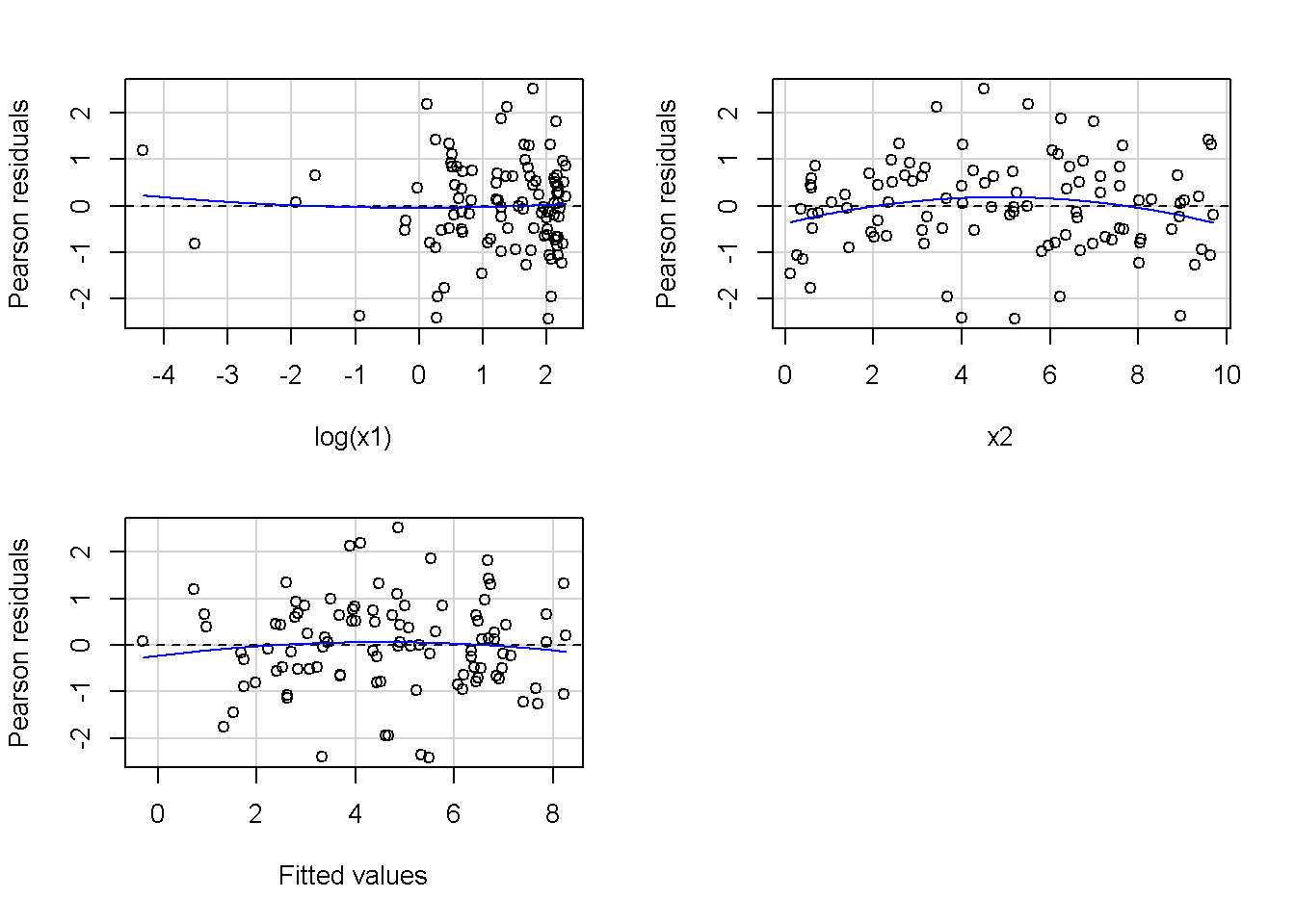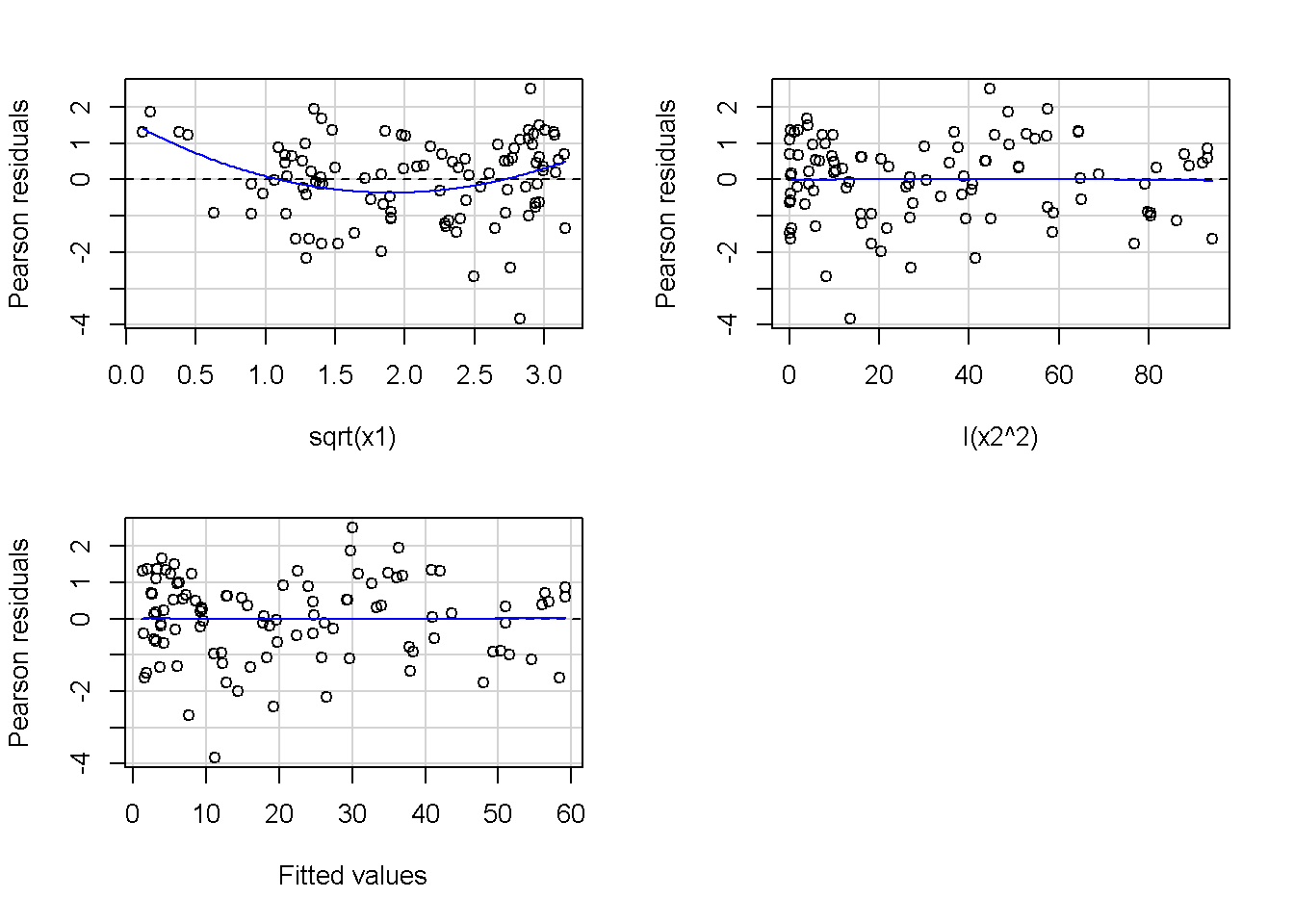 residualPlotsですると正しい形にするとx1はより曲がっているようにも見えます。