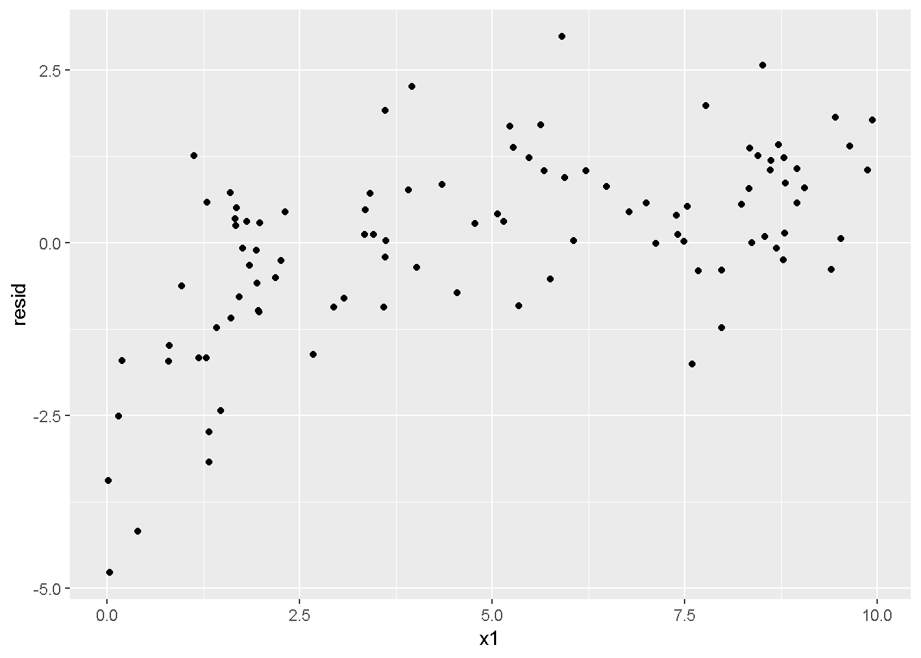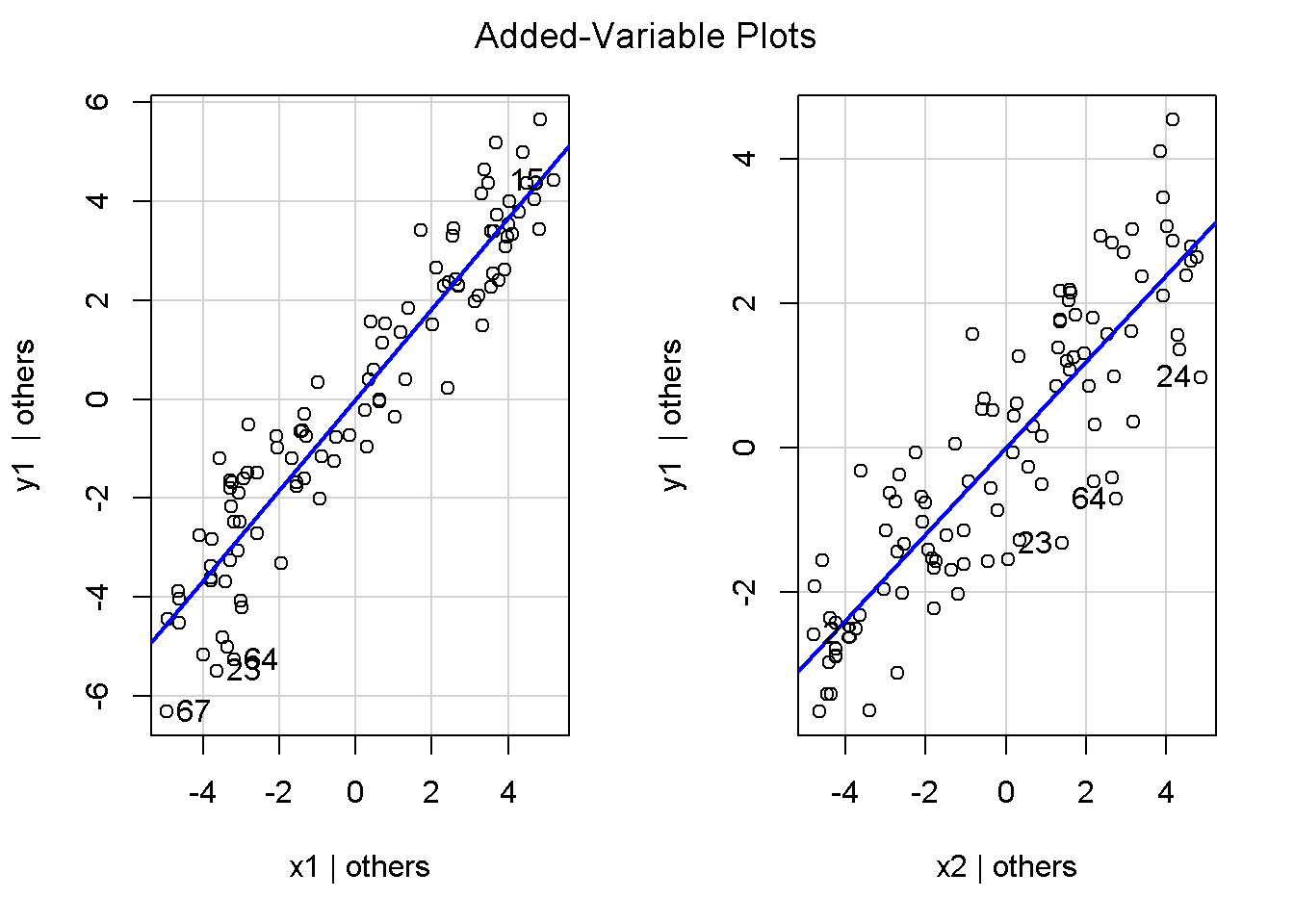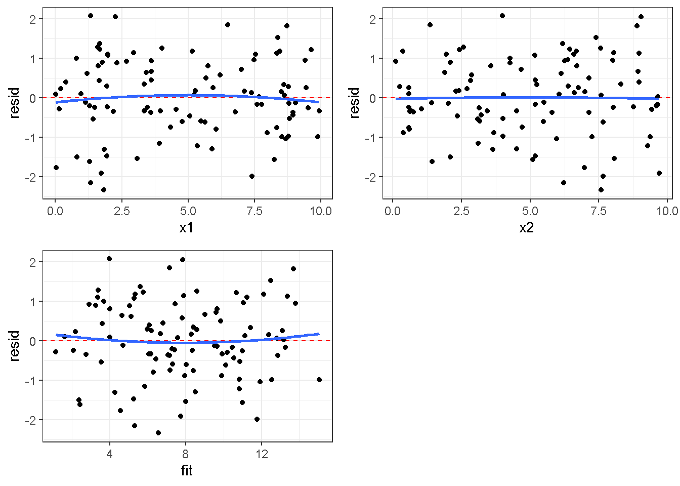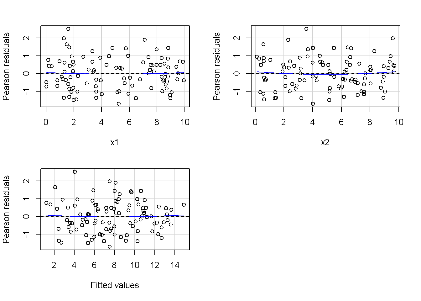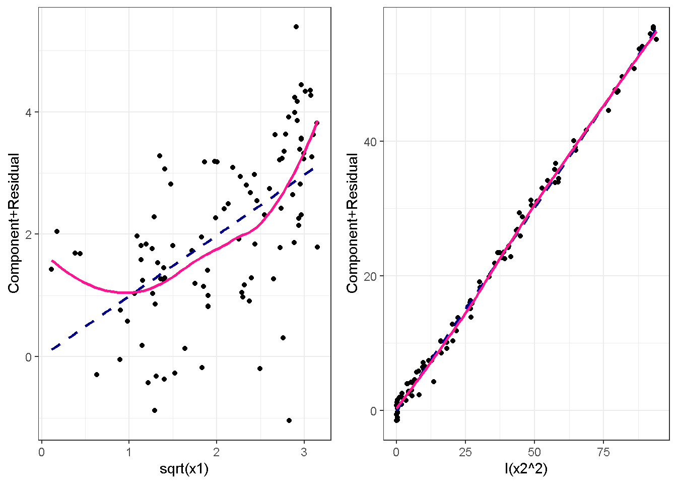 residualPlotsですると正しい形にするとx1はより曲がっているようにも見えます。