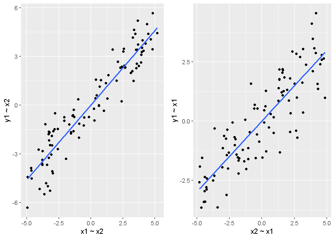 compare_models(list(mod1,mod2),list("y1=x1+N(0,1)","y2=x1+N(10,1)"))