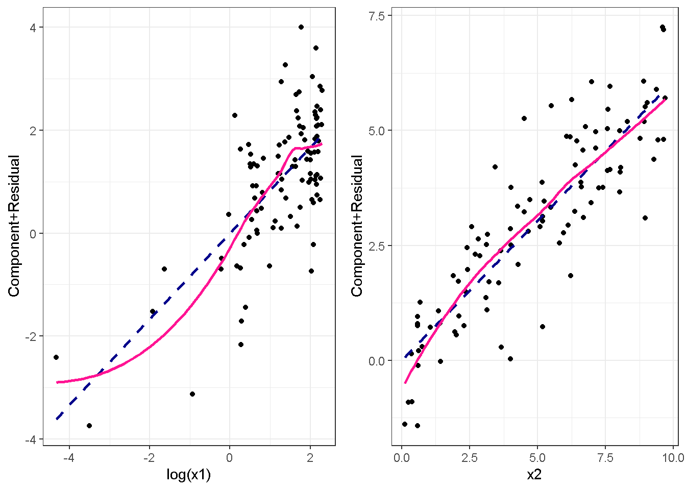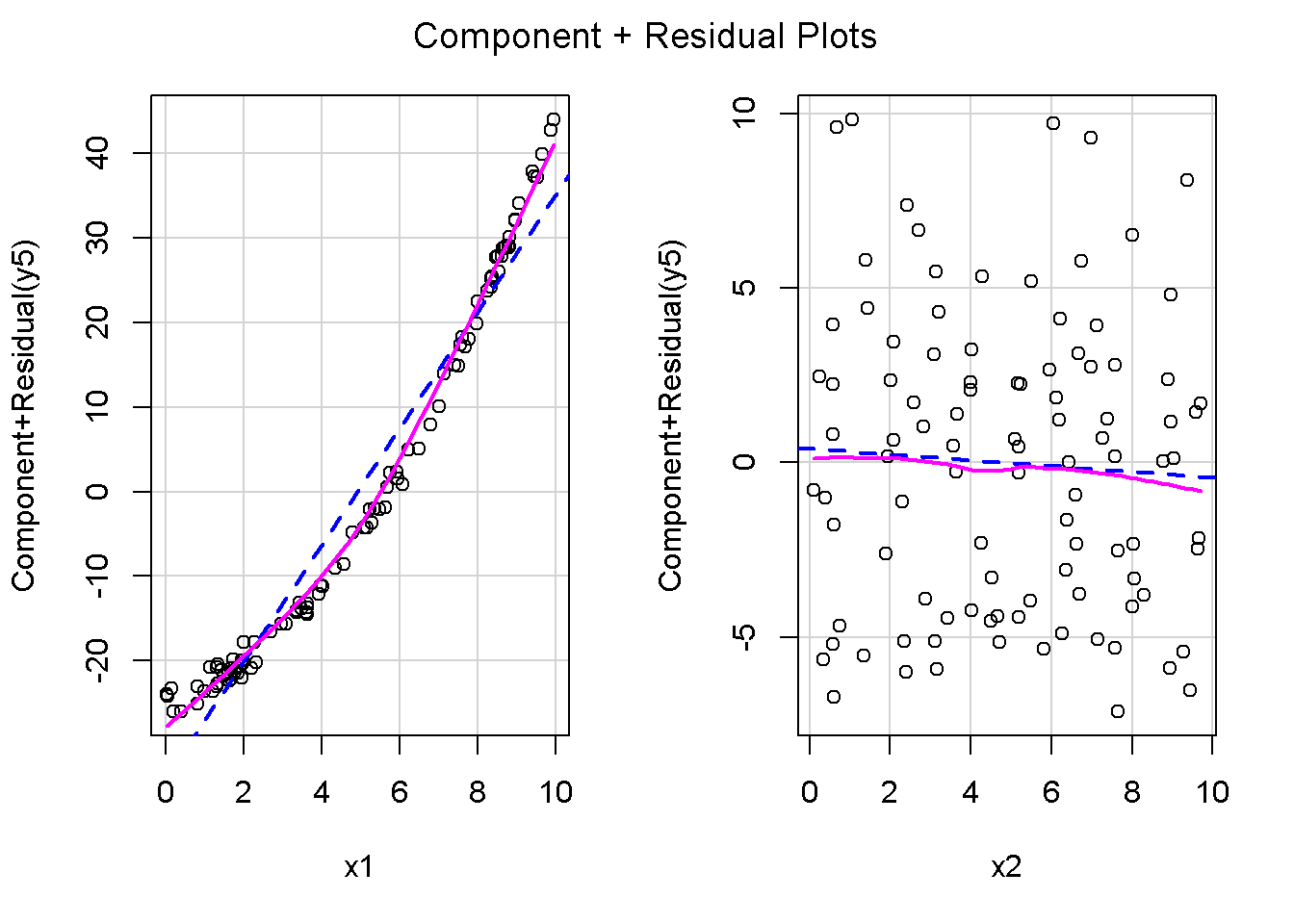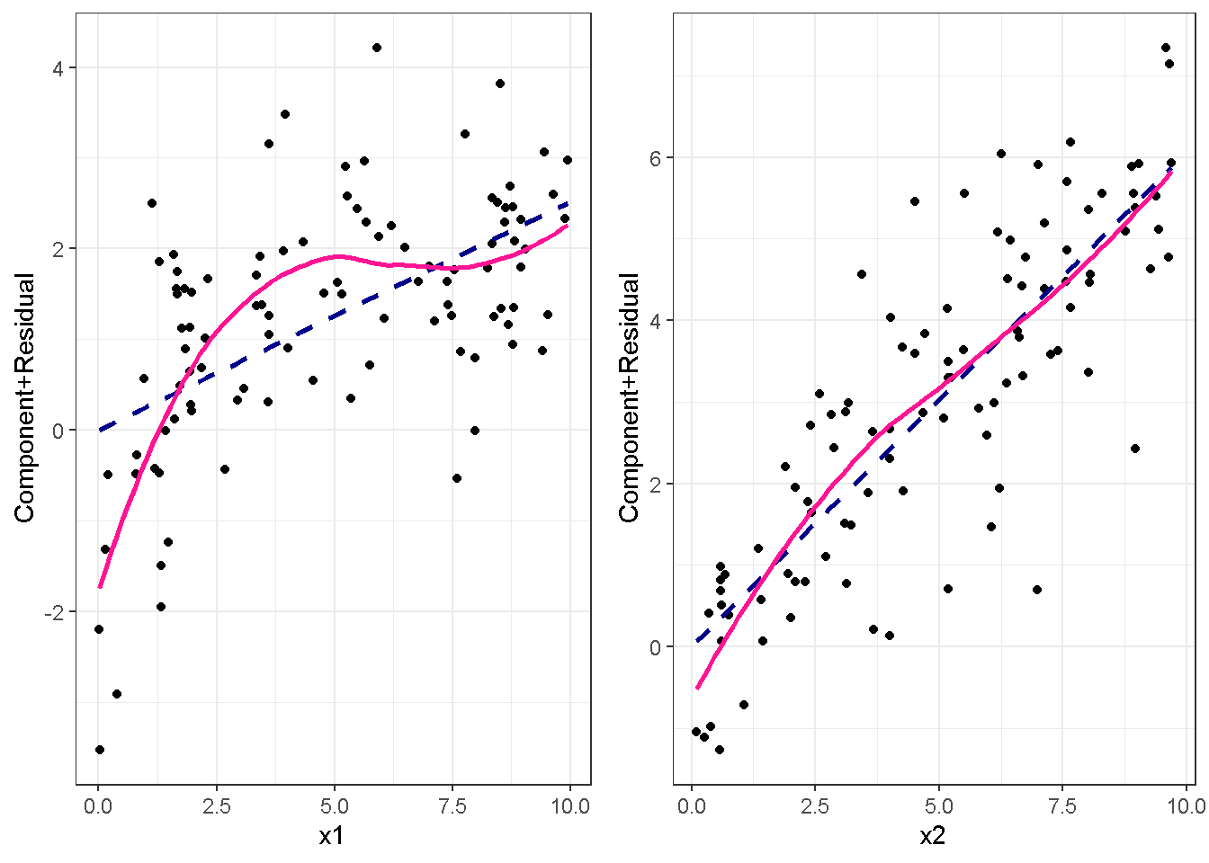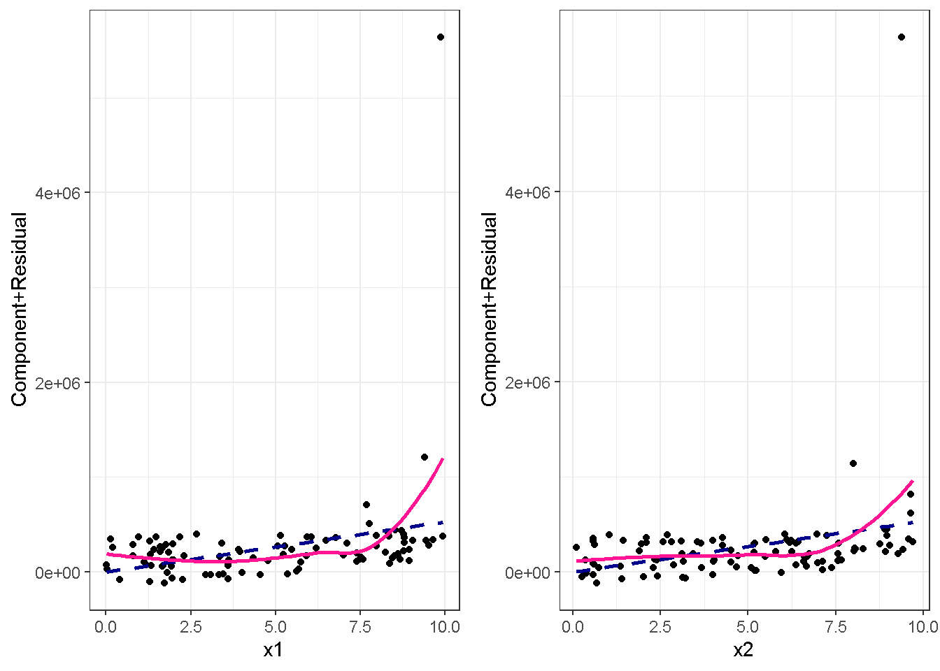 residualPlotsでみると、x1がまだ何かおかしいのが明確にわかります。念のため、carの方でもCRプロット見てみても自作関数と結果変わらないので、やっぱり残差を直接見てあげる方が良いのかもしれません。