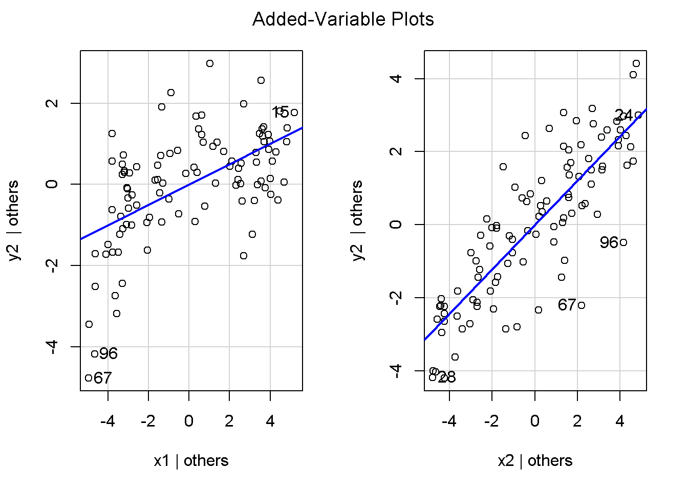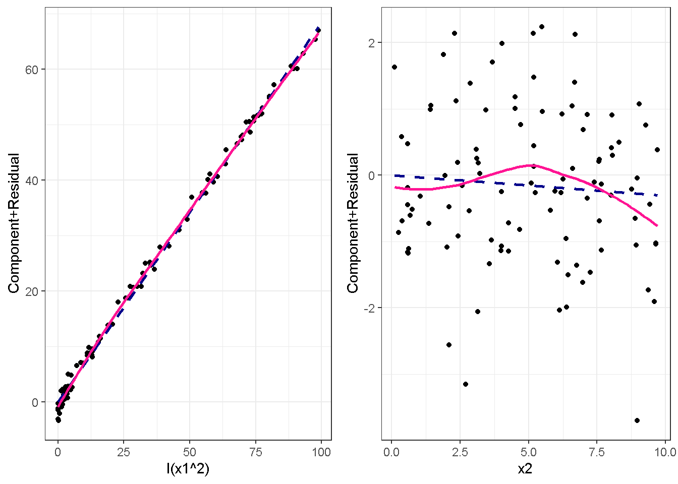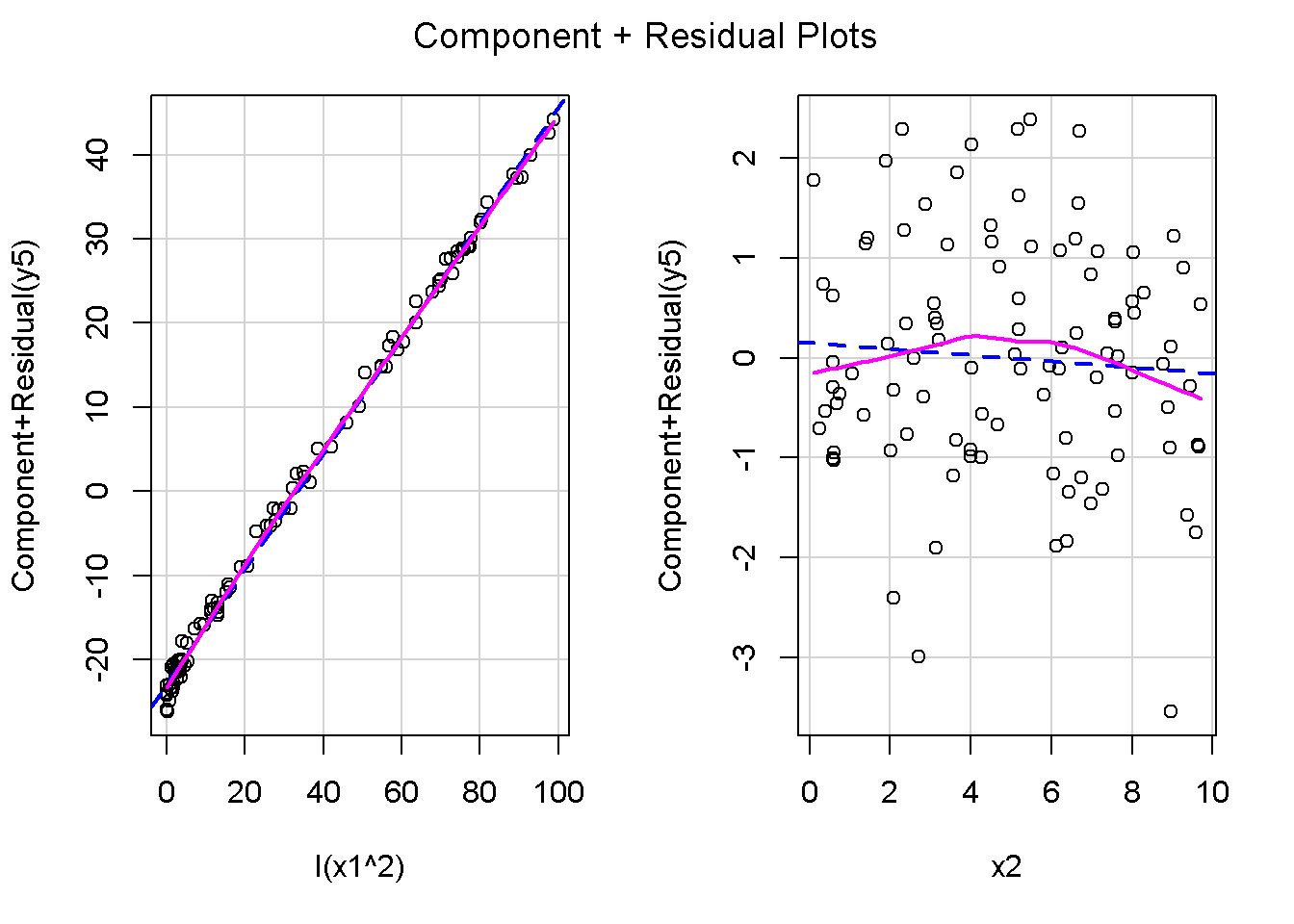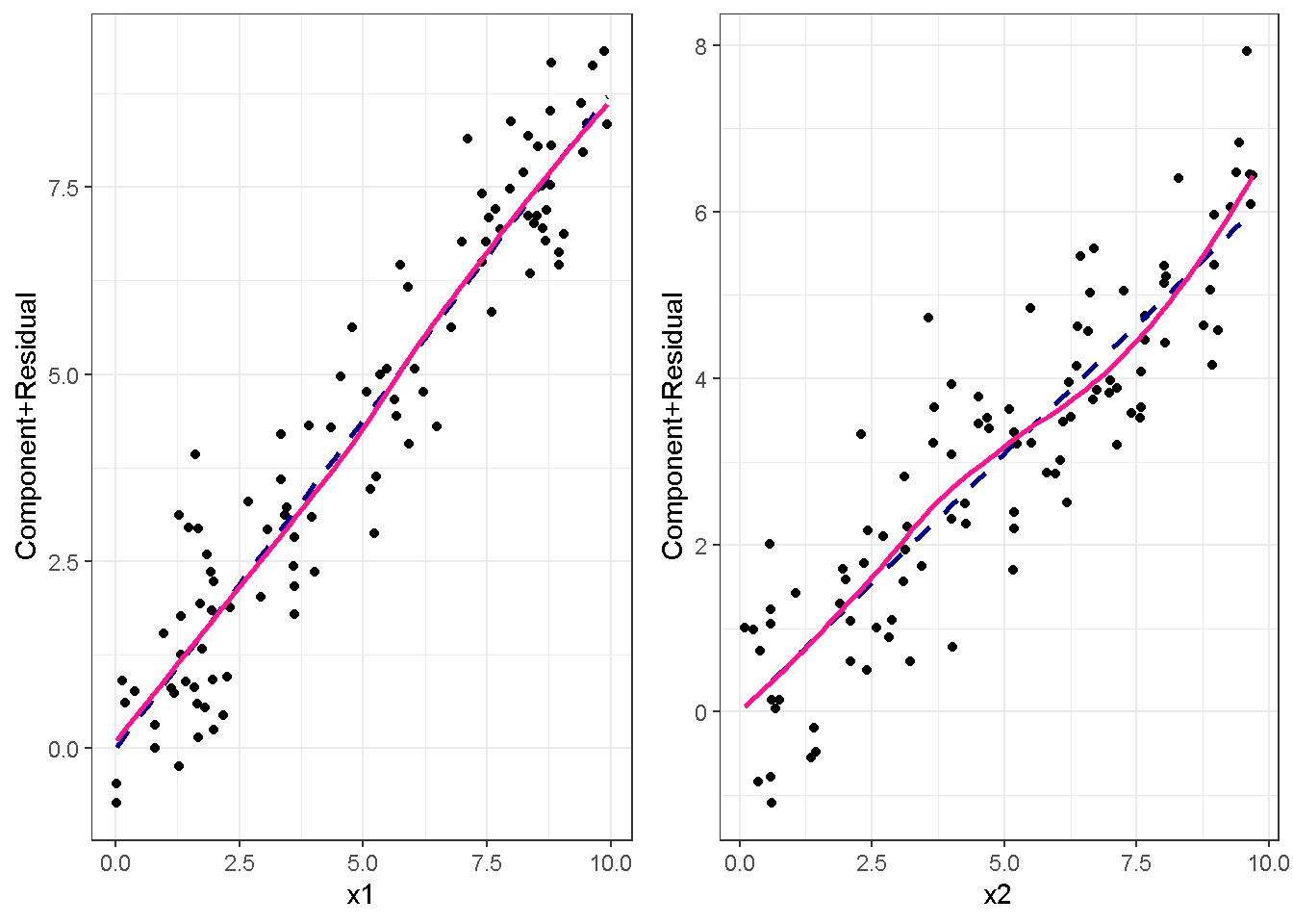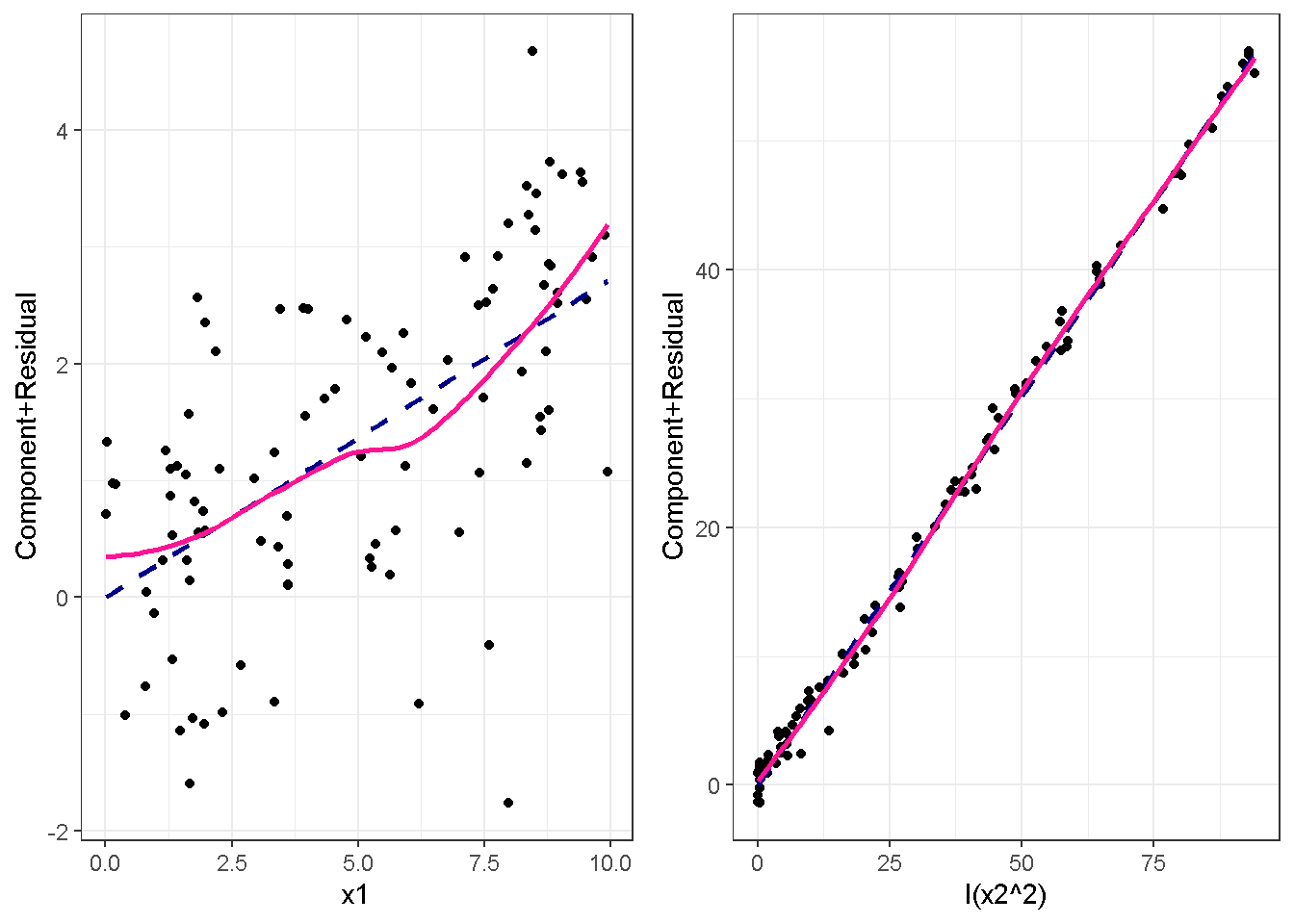 residualPlotsでみると、x1がまだ何かおかしいのが明確にわかります。念のため、carの方でもCRプロット見てみても自作関数と結果変わらないので、やっぱり残差を直接見てあげる方が良いのかもしれません。