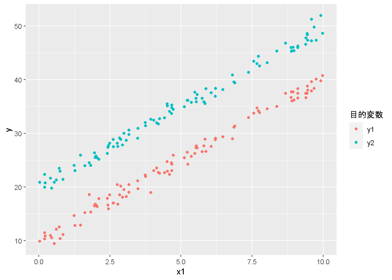誤差項1の正規分布に従う。どちらの目的変数も、βの値は同じであり、$\beta_0=10$,$\beta_1 = 3$と設定しています。