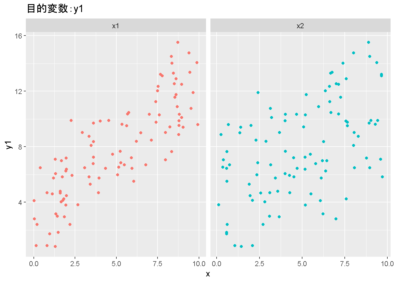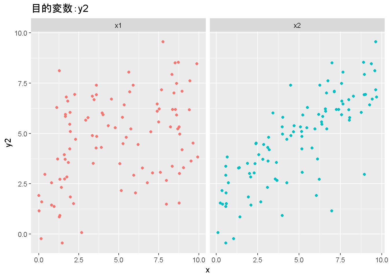 作成したデータはy1変数が誤差項が平均0、SD1の正規分布にしたがい、y2は平均10