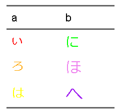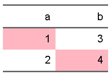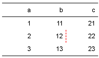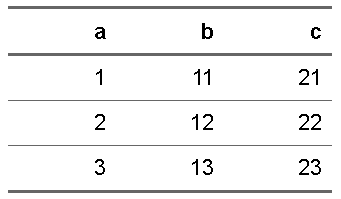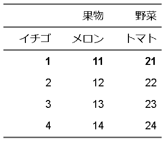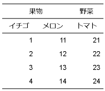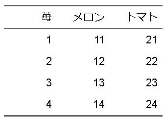 d <- tibble(`イチゴ` = 1:4, `メロン` = 11:14, `トマト` = 21:24)