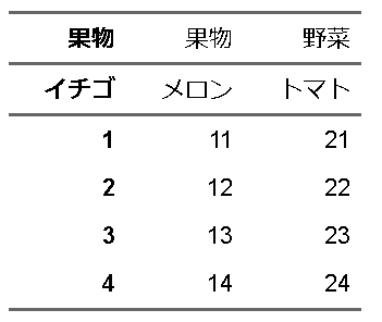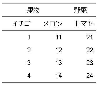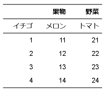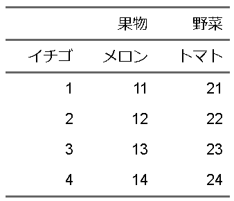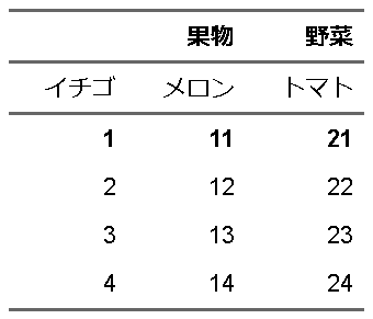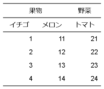 flextable::add_header_row(c("果物","果物","野菜"),top = TRUE) |>
