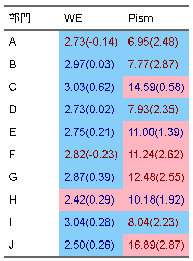 ・Pismは高いと悪いので、10以上で薄い赤の背景、10未満で薄い青の背景。2ポイント以上の増加で赤い文字、それ以下で青い文字